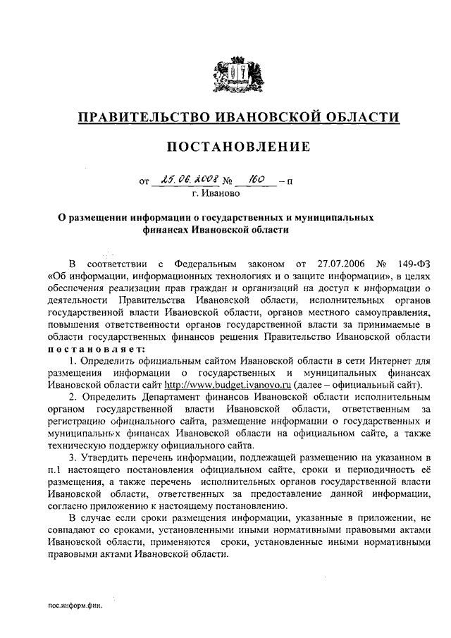 Постановление Правительства Ивановской области от 25.06.2008 N 160-п "О размещении информации о государственных и муниципальных финансах Ивановской области" (вместе с "Перечнем")