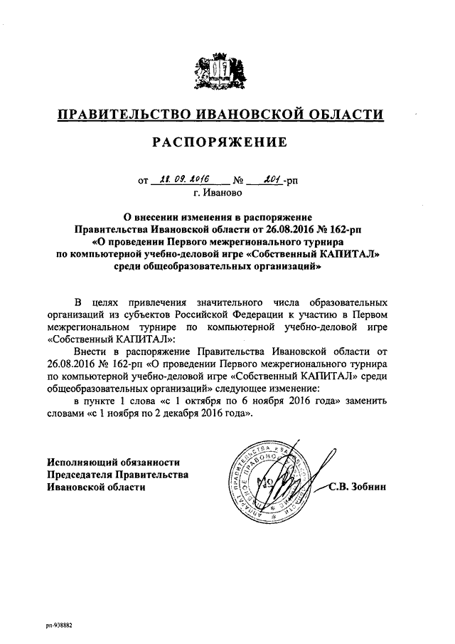 Распоряжение Правительства Ивановской области от 28.09.2016 N 201-рп "О внесении изменения в распоряжение Правительства Ивановской области от 26.08.2016 N 162-рп "О проведении Первого межрегионального турнира по компьютерной учебно-деловой игре "Собственный КАПИТАЛ" среди общеобразовательных организаций"