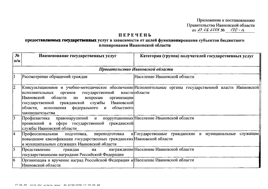 Постановление Правительства Ивановской области от 27.06.2008 N 170-п "Об утверждении перечня предоставляемых государственных услуг в зависимости от целей функционирования субъектов бюджетного планирования Ивановской области"