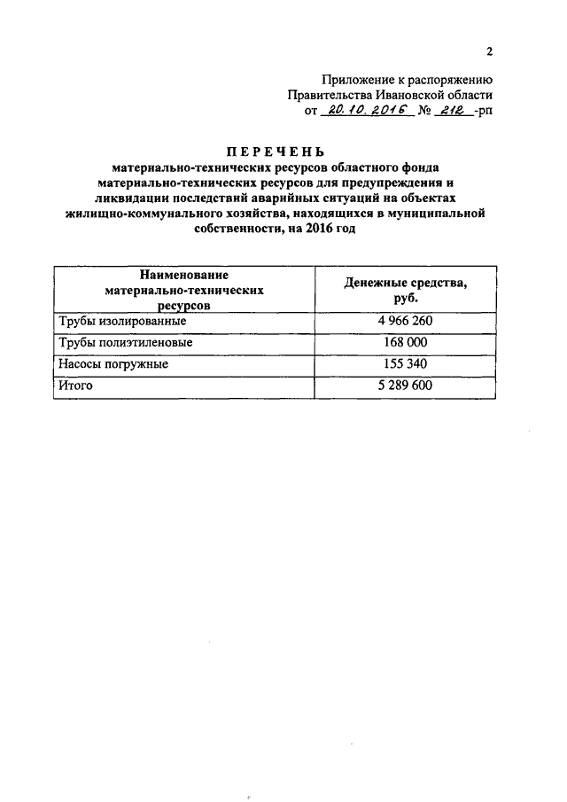 Распоряжение Правительства Ивановской области от 20.10.2016 N 212-рп "Об утверждении перечня материально-технических ресурсов областного фонда материально-технических ресурсов для предупреждения и ликвидации последствий аварийных ситуаций на объектах жилищно-коммунального хозяйства, находящихся в муниципальной собственности, на 2016 год"