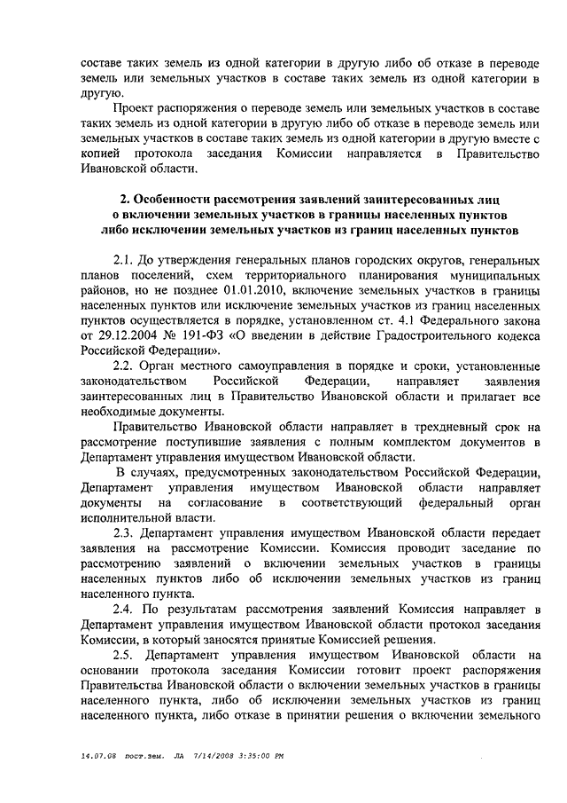 Постановление Правительства Ивановской области от 16.07.2008 N 184-п "О рассмотрении ходатайств о переводе земель или земельных участков в составе таких земель из одной категории в другую и заявлений о включении земельных участков в границы населенных пунктов или исключении земельных участков из границ населенных пунктов" (вместе с "Положением о межведомственной комиссии по рассмотрению ходатайств о переводе земель или земельных участков в составе таких земель из одной категории в другую и заявлений о включении земельных участков в границы населенных пунктов либо об исключении земельных участков из границ населенных пунктов", "Порядком рассмотрения ходатайств о переводе земель или земельных участков в составе таких земель из одной категории в другую и заявлений о включении земельных участков в границы населенных пунктов либо об исключении земельных участков из границ населенных пунктов")