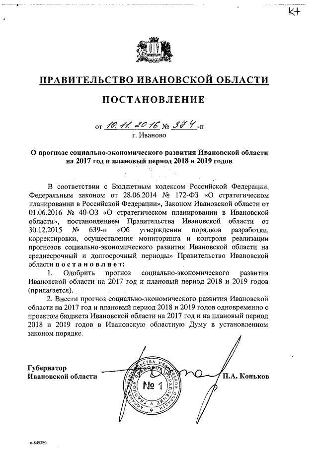 Постановление Правительства Ивановской области от 10.11.2016 N 374-п "О прогнозе социально-экономического развития Ивановской области на 2017 год и плановый период 2018 и 2019 годов"