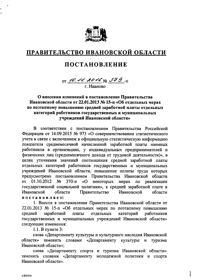Постановление Правительства Ивановской области от 10.11.2016 N 379-п "О внесении изменений в постановление Правительства Ивановской области от 22.01.2013 N 15-п "Об отдельных мерах по поэтапному повышению средней заработной платы отдельных категорий работников государственных и муниципальных учреждений Ивановской области"