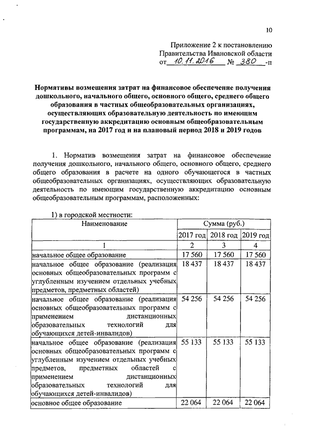 Постановление Правительства Ивановской области от 10.11.2016 N 380-п "Об утверждении нормативов обеспечения государственных гарантий реализации прав на получение общедоступного и бесплатного общего образования, обеспечения дополнительного образования в муниципальных образовательных организациях и возмещения затрат на финансовое обеспечение получения общего образования в частных образовательных организациях на 2017 год и на плановый период 2018 и 2019 годов" (вместе с "Нормативами обеспечения государственных гарантий реализации прав на получение общедоступного и бесплатного дошкольного, начального общего, основного общего, среднего общего образования в муниципальных общеобразовательных организациях, обеспечения дополнительного образования в муниципальных общеобразовательных организациях на 2017 год и на плановый период 2018 и 2019 годов", "Нормативами возмещения затрат на финансовое обеспечение получения дошкольного, начального общего, основного общего, среднего общего образования в частных общеобразовательных организациях, осуществляющих образовательную деятельность по имеющим государственную аккредитацию основным общеобразовательным программам, на 2017 год и на плановый период 2018 и 2019 годов", "Нормативами обеспечения государственных гарантий реализации прав на получение общедоступного и бесплатного дошкольного образования в муниципальных дошкольных образовательных организациях на 2017 год и на плановый период 2018 и 2019 годов", "Нормативами возмещения затрат на финансовое обеспечение получения дошкольного образования в частных дошкольных образовательных организациях на 2017 год и на плановый период 2018 и 2019 годов", "Перечнем малокомплектных муниципальных общеобразовательных организаций, для которых применяется норматив финансового обеспечения, учитывающий затраты, не зависящие от количества обучающихся, для расчета субвенций местным бюджетам в размере, необходимом для реализации основных общеобразовательных программ в части финансирования расходов на оплату труда работников общеобразовательных организаций, расходов на учебники, учебные пособия, средства обучения, игры, игрушки (за исключением расходов на содержание зданий и оплату коммунальных услуг, осуществляемых из местных бюджетов)")
