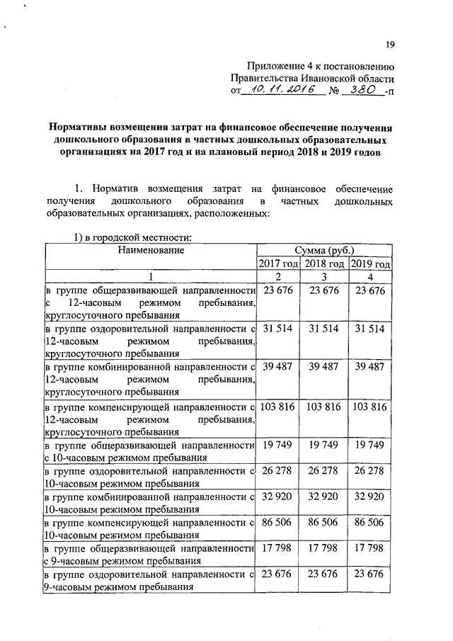 Постановление Правительства Ивановской области от 10.11.2016 N 380-п "Об утверждении нормативов обеспечения государственных гарантий реализации прав на получение общедоступного и бесплатного общего образования, обеспечения дополнительного образования в муниципальных образовательных организациях и возмещения затрат на финансовое обеспечение получения общего образования в частных образовательных организациях на 2017 год и на плановый период 2018 и 2019 годов" (вместе с "Нормативами обеспечения государственных гарантий реализации прав на получение общедоступного и бесплатного дошкольного, начального общего, основного общего, среднего общего образования в муниципальных общеобразовательных организациях, обеспечения дополнительного образования в муниципальных общеобразовательных организациях на 2017 год и на плановый период 2018 и 2019 годов", "Нормативами возмещения затрат на финансовое обеспечение получения дошкольного, начального общего, основного общего, среднего общего образования в частных общеобразовательных организациях, осуществляющих образовательную деятельность по имеющим государственную аккредитацию основным общеобразовательным программам, на 2017 год и на плановый период 2018 и 2019 годов", "Нормативами обеспечения государственных гарантий реализации прав на получение общедоступного и бесплатного дошкольного образования в муниципальных дошкольных образовательных организациях на 2017 год и на плановый период 2018 и 2019 годов", "Нормативами возмещения затрат на финансовое обеспечение получения дошкольного образования в частных дошкольных образовательных организациях на 2017 год и на плановый период 2018 и 2019 годов", "Перечнем малокомплектных муниципальных общеобразовательных организаций, для которых применяется норматив финансового обеспечения, учитывающий затраты, не зависящие от количества обучающихся, для расчета субвенций местным бюджетам в размере, необходимом для реализации основных общеобразовательных программ в части финансирования расходов на оплату труда работников общеобразовательных организаций, расходов на учебники, учебные пособия, средства обучения, игры, игрушки (за исключением расходов на содержание зданий и оплату коммунальных услуг, осуществляемых из местных бюджетов)")