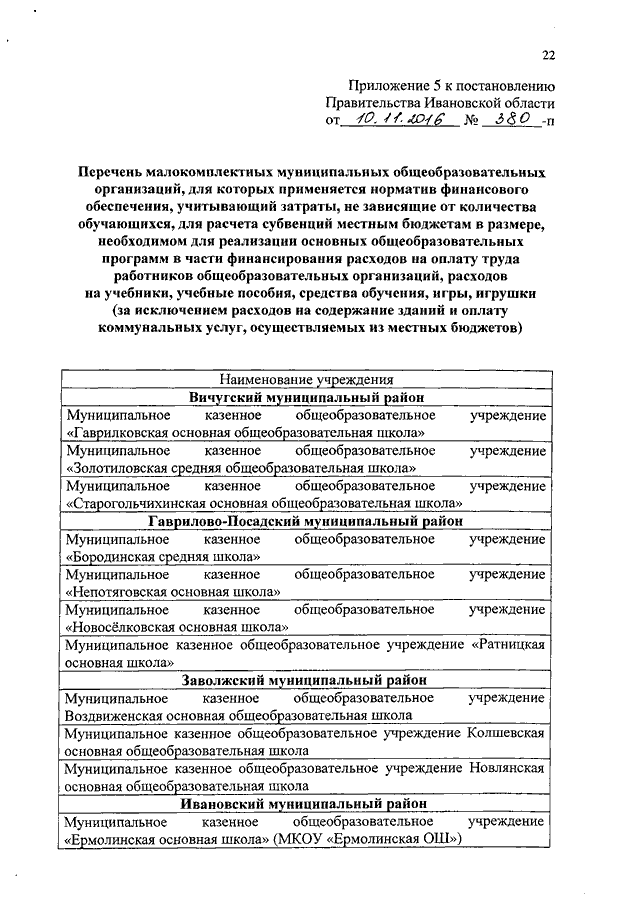 Постановление Правительства Ивановской области от 10.11.2016 N 380-п "Об утверждении нормативов обеспечения государственных гарантий реализации прав на получение общедоступного и бесплатного общего образования, обеспечения дополнительного образования в муниципальных образовательных организациях и возмещения затрат на финансовое обеспечение получения общего образования в частных образовательных организациях на 2017 год и на плановый период 2018 и 2019 годов" (вместе с "Нормативами обеспечения государственных гарантий реализации прав на получение общедоступного и бесплатного дошкольного, начального общего, основного общего, среднего общего образования в муниципальных общеобразовательных организациях, обеспечения дополнительного образования в муниципальных общеобразовательных организациях на 2017 год и на плановый период 2018 и 2019 годов", "Нормативами возмещения затрат на финансовое обеспечение получения дошкольного, начального общего, основного общего, среднего общего образования в частных общеобразовательных организациях, осуществляющих образовательную деятельность по имеющим государственную аккредитацию основным общеобразовательным программам, на 2017 год и на плановый период 2018 и 2019 годов", "Нормативами обеспечения государственных гарантий реализации прав на получение общедоступного и бесплатного дошкольного образования в муниципальных дошкольных образовательных организациях на 2017 год и на плановый период 2018 и 2019 годов", "Нормативами возмещения затрат на финансовое обеспечение получения дошкольного образования в частных дошкольных образовательных организациях на 2017 год и на плановый период 2018 и 2019 годов", "Перечнем малокомплектных муниципальных общеобразовательных организаций, для которых применяется норматив финансового обеспечения, учитывающий затраты, не зависящие от количества обучающихся, для расчета субвенций местным бюджетам в размере, необходимом для реализации основных общеобразовательных программ в части финансирования расходов на оплату труда работников общеобразовательных организаций, расходов на учебники, учебные пособия, средства обучения, игры, игрушки (за исключением расходов на содержание зданий и оплату коммунальных услуг, осуществляемых из местных бюджетов)")