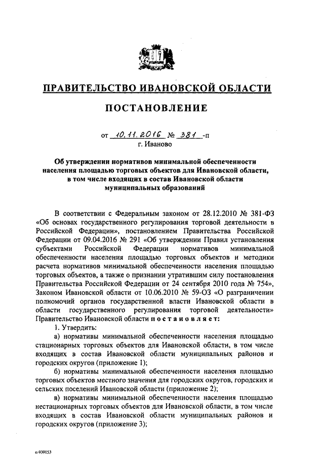 Постановление Правительства Ивановской области от 10.11.2016 N 381-п "Об утверждении нормативов минимальной обеспеченности населения площадью торговых объектов для Ивановской области, в том числе входящих в состав Ивановской области муниципальных образований" (вместе с "Нормативами минимальной обеспеченности населения площадью стационарных торговых объектов для Ивановской области, в том числе входящих в состав Ивановской области муниципальных районов и городских округов", "Нормативами минимальной обеспеченности населения площадью торговых объектов местного значения для городских округов, городских и сельских поселений Ивановской области", "Нормативами минимальной обеспеченности населения площадью нестационарных торговых объектов для Ивановской области, в том числе входящих в состав Ивановской области муниципальных районов и городских округов", "Нормативами минимальной обеспеченности населения площадью торговых мест, используемых для осуществления деятельности по продаже продовольственных товаров на розничных рынках, для Ивановской области, в том числе входящих в состав Ивановской области муниципальных районов и городских округов")