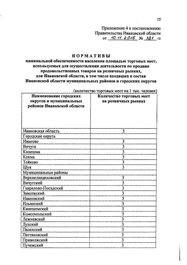 Постановление Правительства Ивановской области от 10.11.2016 N 381-п "Об утверждении нормативов минимальной обеспеченности населения площадью торговых объектов для Ивановской области, в том числе входящих в состав Ивановской области муниципальных образований" (вместе с "Нормативами минимальной обеспеченности населения площадью стационарных торговых объектов для Ивановской области, в том числе входящих в состав Ивановской области муниципальных районов и городских округов", "Нормативами минимальной обеспеченности населения площадью торговых объектов местного значения для городских округов, городских и сельских поселений Ивановской области", "Нормативами минимальной обеспеченности населения площадью нестационарных торговых объектов для Ивановской области, в том числе входящих в состав Ивановской области муниципальных районов и городских округов", "Нормативами минимальной обеспеченности населения площадью торговых мест, используемых для осуществления деятельности по продаже продовольственных товаров на розничных рынках, для Ивановской области, в том числе входящих в состав Ивановской области муниципальных районов и городских округов")