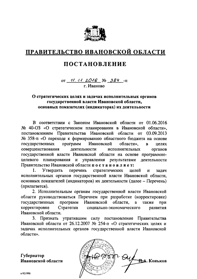Постановление Правительства Ивановской области от 11.11.2016 N 384-п "О стратегических целях и задачах исполнительных органов государственной власти Ивановской области, основных показателях (индикаторах) их деятельности" (вместе с "Перечнем стратегических целей и задач исполнительных органов государственной власти Ивановской области, основных показателей (индикаторов) их деятельности")