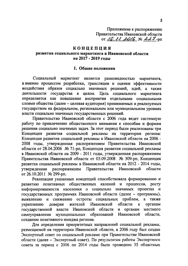 Распоряжение Правительства Ивановской области от 10.11.2016 N 227-рп "Об утверждении Концепции развития социального маркетинга в Ивановской области на 2017 - 2019 годы"