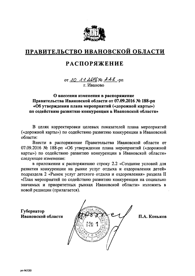 Распоряжение Правительства Ивановской области от 10.11.2016 N 228-рп "О внесении изменения в распоряжение Правительства Ивановской области от 07.09.2016 N 188-рп "Об утверждении плана мероприятий ("дорожной карты") по содействию развитию конкуренции в Ивановской области"