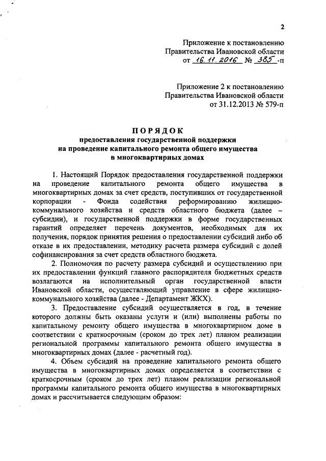 Постановление Правительства Ивановской области от 16.11.2016 N 385-п "О внесении изменений в постановление Правительства Ивановской области от 31.12.2013 N 579-п "Об утверждении порядков, регулирующих отношения в сфере обеспечения проведения капитального ремонта общего имущества в многоквартирных домах, расположенных на территории Ивановской области" (вместе с "Порядком предоставления государственной поддержки на проведение капитального ремонта общего имущества в многоквартирных домах")