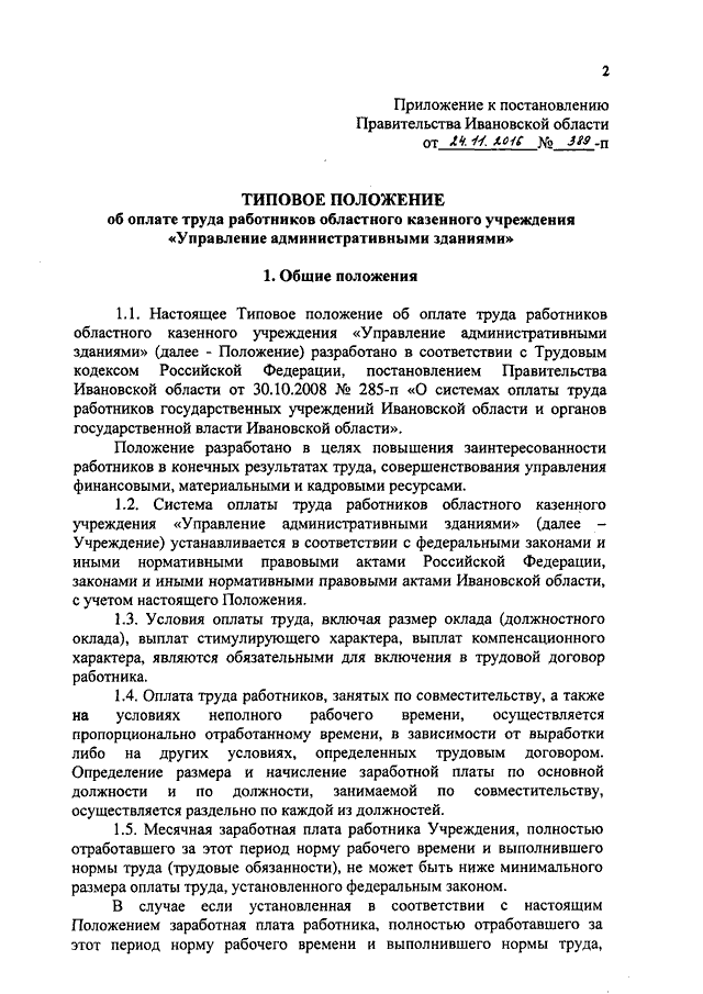Постановление Правительства Ивановской области от 24.11.2016 N 389-п "О системе оплаты труда работников областного казенного учреждения "Управление административными зданиями" (вместе с "Типовым положением об оплате труда работников областного казенного учреждения "Управление административными зданиями")