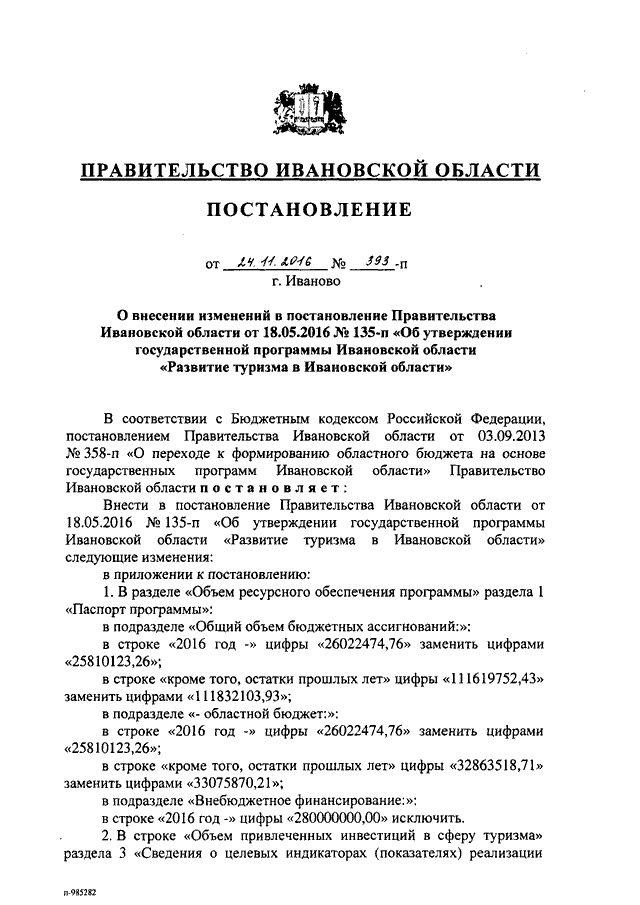 Постановление Правительства Ивановской области от 24.11.2016 N 393-п "О внесении изменений в постановление Правительства Ивановской области от 18.05.2016 N 135-п "Об утверждении государственной программы Ивановской области "Развитие туризма в Ивановской области"
