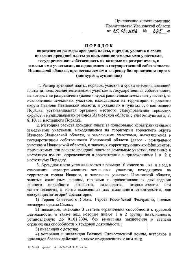 Постановление Правительства Ивановской области от 25.08.2008 N 225-п "Об арендной плате за пользование земельными участками, государственная собственность на которые не разграничена, и земельными участками, находящимися в государственной собственности Ивановской области" (вместе с "Порядком определения размера арендной платы, порядком, условиями и сроками внесения арендной платы за пользование земельными участками, государственная собственность на которые не разграничена, и земельными участками, находящимися в государственной собственности Ивановской области, предоставляемыми в аренду без проведения торгов (конкурсов, аукционов)")