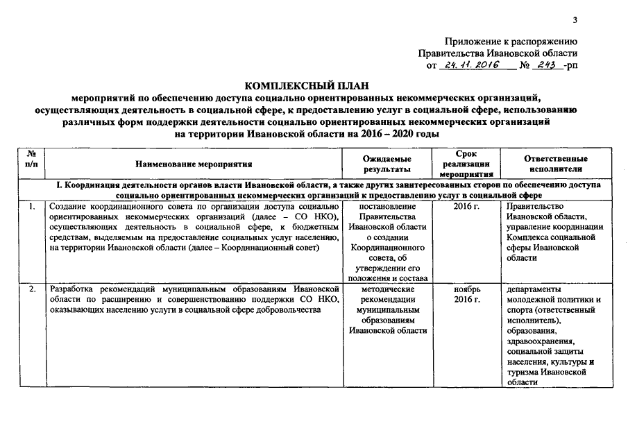 Распоряжение Правительства Ивановской области от 24.11.2016 N 243-рп "Об утверждении комплексного плана мероприятий по обеспечению поэтапного доступа социально ориентированных некоммерческих организаций, осуществляющих деятельность в социальной сфере, к предоставлению услуг в социальной сфере, использованию различных форм поддержки деятельности социально ориентированных некоммерческих организаций на территории Ивановской области на 2016 - 2020 годы"