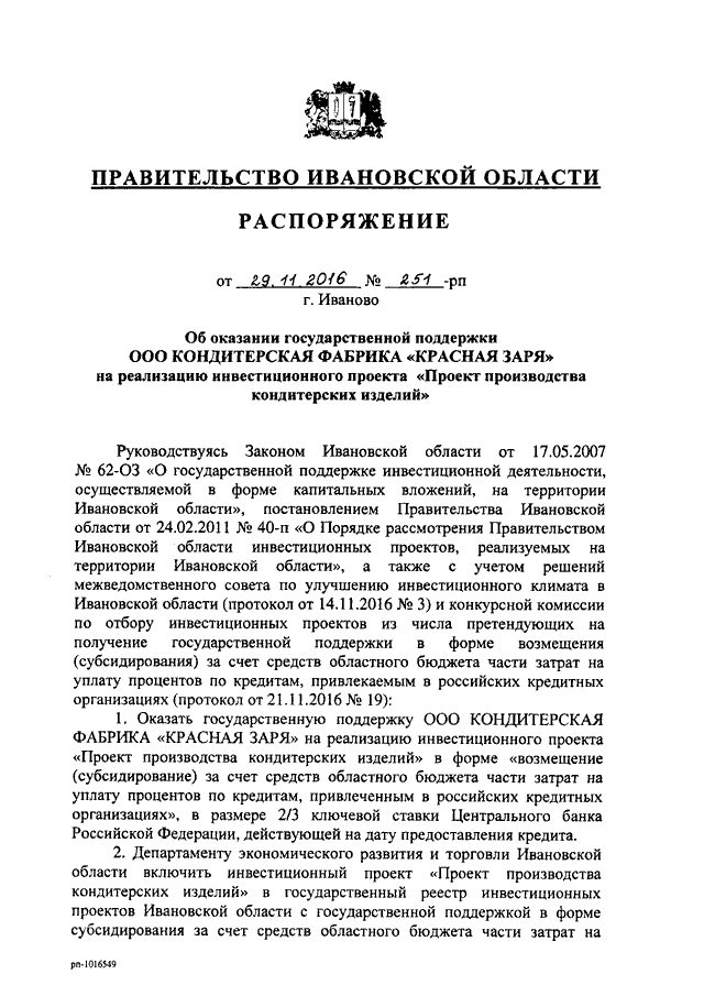 Распоряжение Правительства Ивановской области от 29.11.2016 N 251-рп "Об оказании государственной поддержки ООО КОНДИТЕРСКАЯ ФАБРИКА "КРАСНАЯ ЗАРЯ" на реализацию инвестиционного проекта "Проект производства кондитерских изделий"