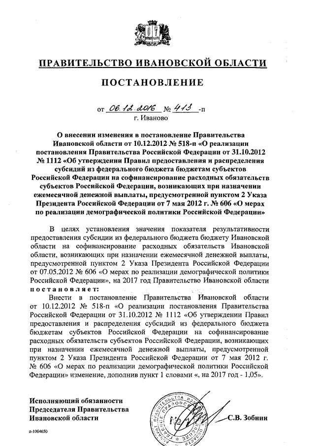 Постановление Правительства Ивановской области от 06.12.2016 N 413-п "О внесении изменения в постановление Правительства Ивановской области от 10.12.2012 N 518-п "О реализации постановления Правительства Российской Федерации от 31.10.2012 N 1112 "Об утверждении Правил предоставления и распределения субсидий из федерального бюджета бюджетам субъектов Российской Федерации на софинансирование расходных обязательств субъектов Российской Федерации, возникающих при назначении ежемесячной денежной выплаты, предусмотренной пунктом 2 Указа Президента Российской Федерации от 7 мая 2012 г. N 606 "О мерах по реализации демографической политики Российской Федерации"