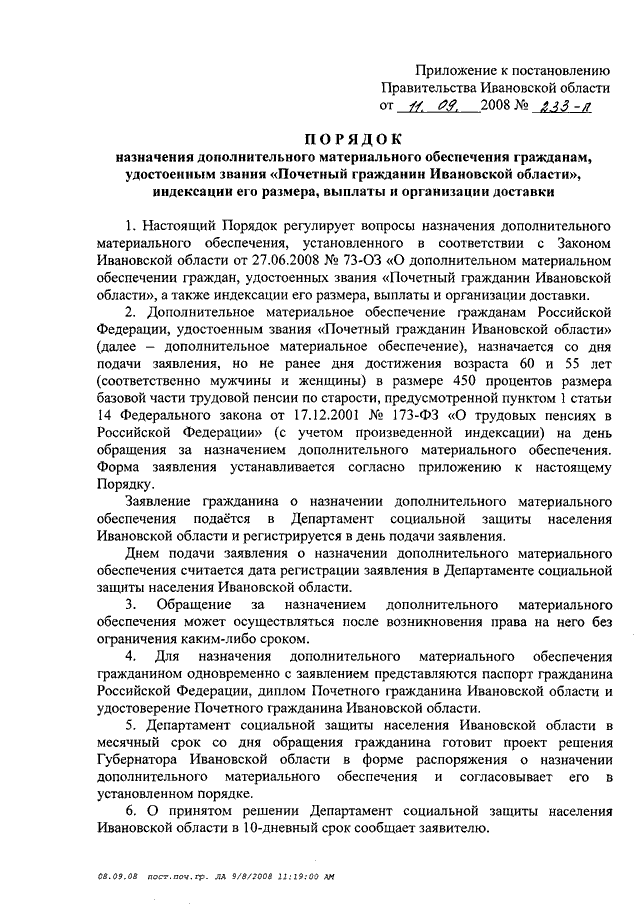 Постановление Правительства Ивановской области от 11.09.2008 N 233-п "О Порядке назначения дополнительного материального обеспечения гражданам, удостоенным звания "Почетный гражданин Ивановской области", индексации его размера, выплаты и организации доставки"
