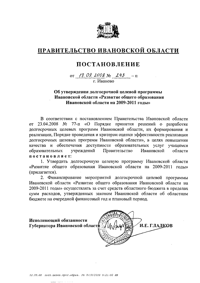 Постановление Правительства Ивановской области от 19.09.2008 N 243-п "Об утверждении долгосрочной целевой программы Ивановской области "Развитие общего образования Ивановской области на 2009 - 2011 годы"