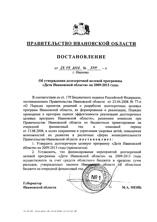 Постановление Правительства Ивановской области от 24.09.2008 N 244-п "Об утверждении долгосрочной целевой программы "Дети Ивановской области" на 2009 - 2013 годы"