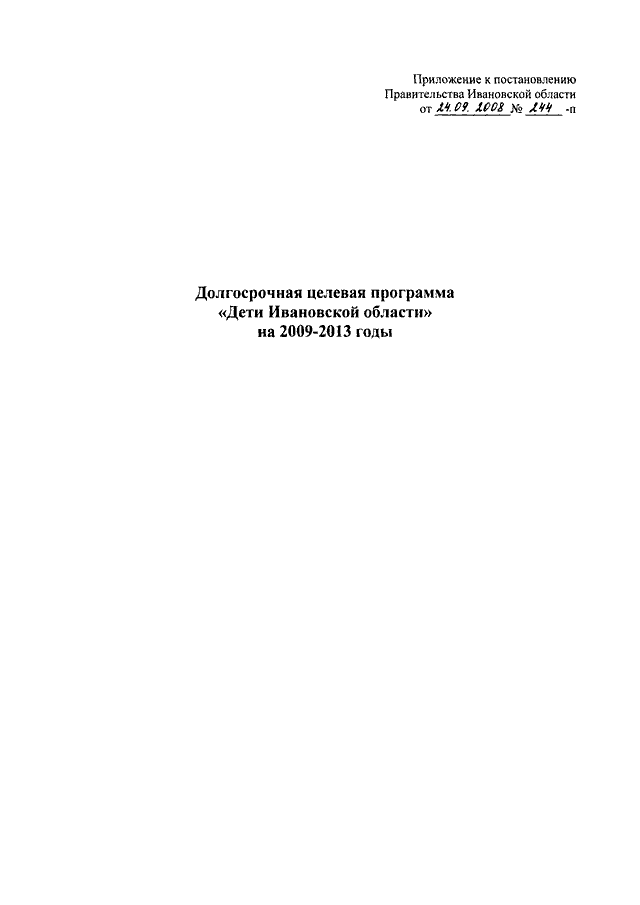Постановление Правительства Ивановской области от 24.09.2008 N 244-п "Об утверждении долгосрочной целевой программы "Дети Ивановской области" на 2009 - 2013 годы"