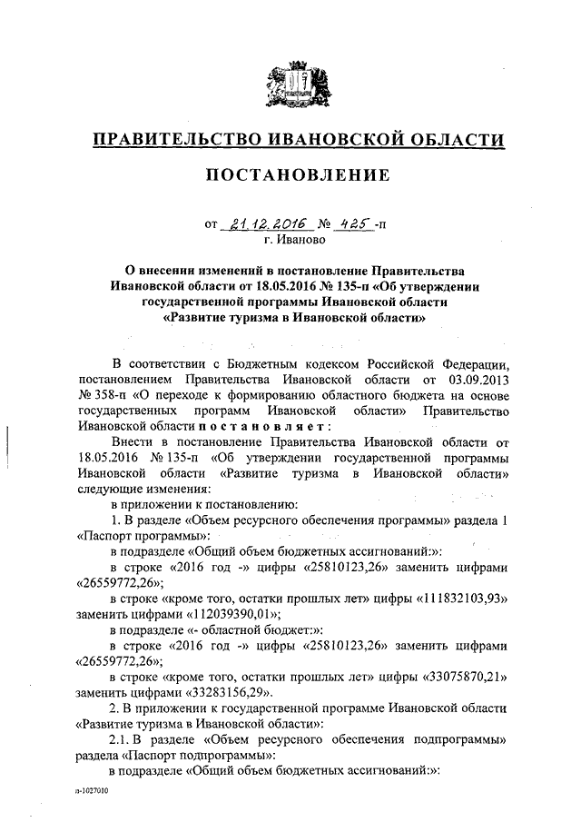 Постановление Правительства Ивановской области от 21.12.2016 N 425-п "О внесении изменений в постановление Правительства Ивановской области от 18.05.2016 N 135-п "Об утверждении государственной программы Ивановской области "Развитие туризма в Ивановской области"