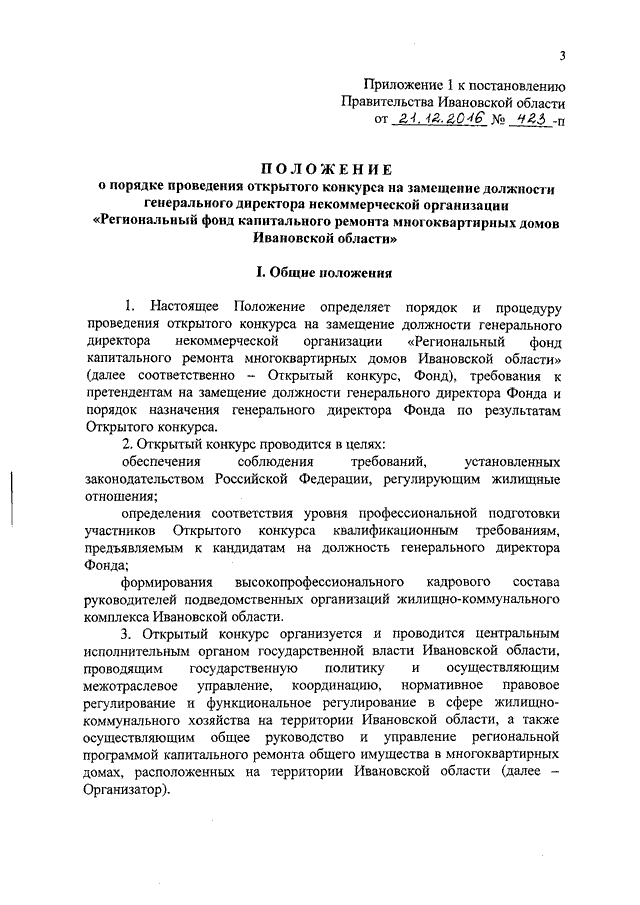 Постановление Правительства Ивановской области от 21.12.2016 N 423-п "Об утверждении Положения о порядке проведения открытого конкурса на замещение должности генерального директора некоммерческой организации "Региональный фонд капитального ремонта многоквартирных домов Ивановской области"