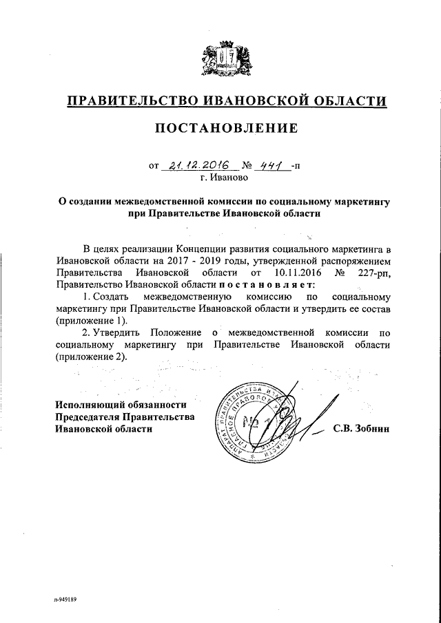 Постановление Правительства Ивановской области от 21.12.2016 N 441-п "О создании межведомственной комиссии по социальному маркетингу при Правительстве Ивановской области" (вместе с "Положением о межведомственной комиссии по социальному маркетингу при Правительстве Ивановской области")