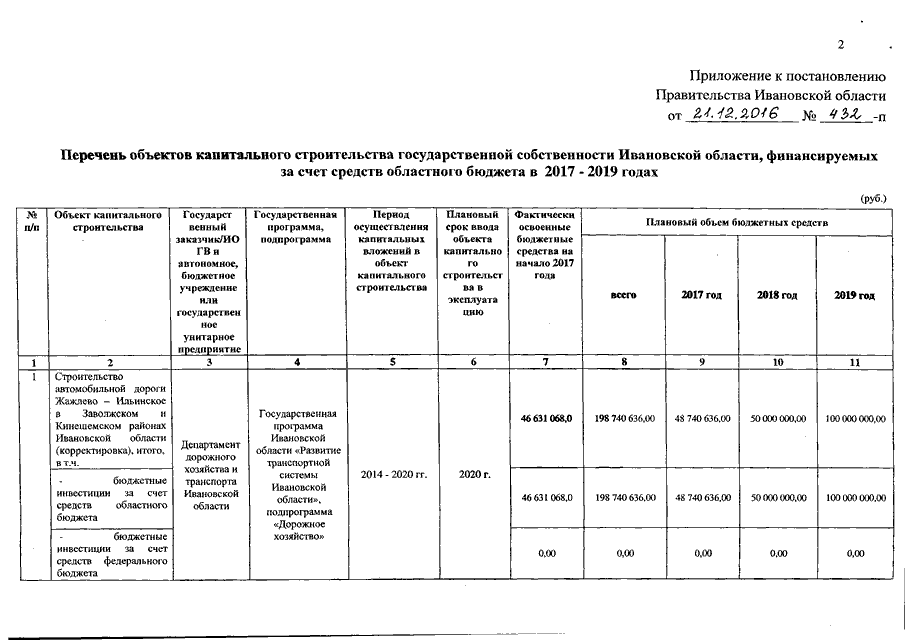 Постановление Правительства Ивановской области от 21.12.2016 N 432-п "Об утверждении перечня объектов капитального строительства государственной собственности Ивановской области, финансируемых за счет средств областного бюджета в 2017 - 2019 годах"