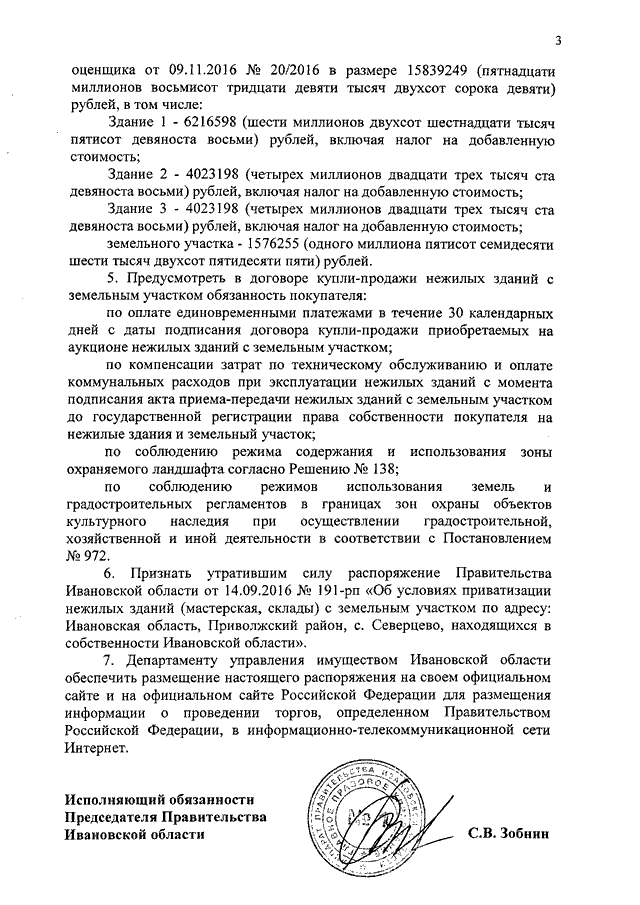 Распоряжение Правительства Ивановской области от 21.12.2016 N 266-рп "Об условиях приватизации нежилых зданий (мастерская, склады) с земельным участком по адресу: Ивановская область, Приволжский район, с. Северцево, находящихся в собственности Ивановской области"