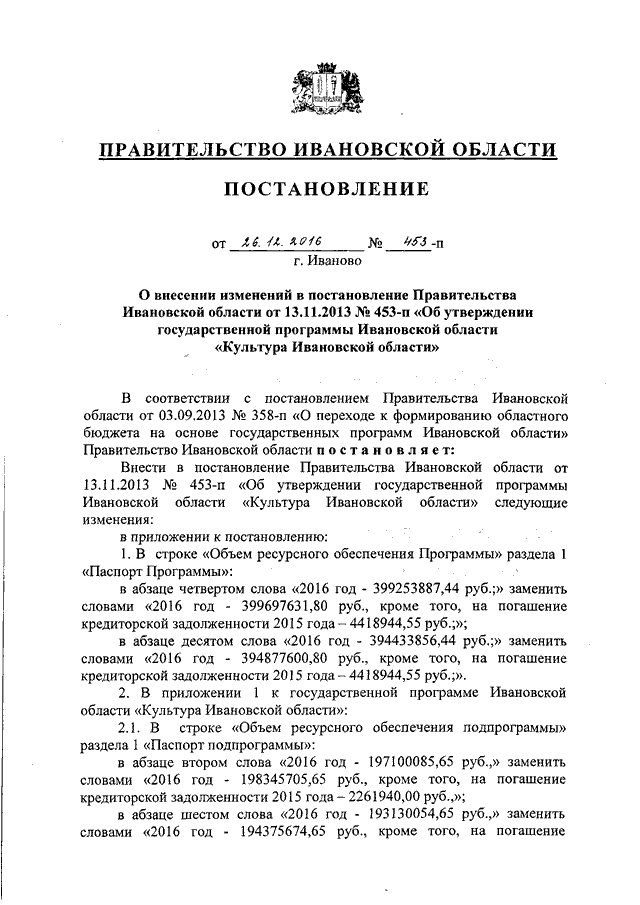 Постановление Правительства Ивановской области от 26.12.2016 N 453-п "О внесении изменений в постановление Правительства Ивановской области от 13.11.2013 N 453-п "Об утверждении государственной программы Ивановской области "Культура Ивановской области"