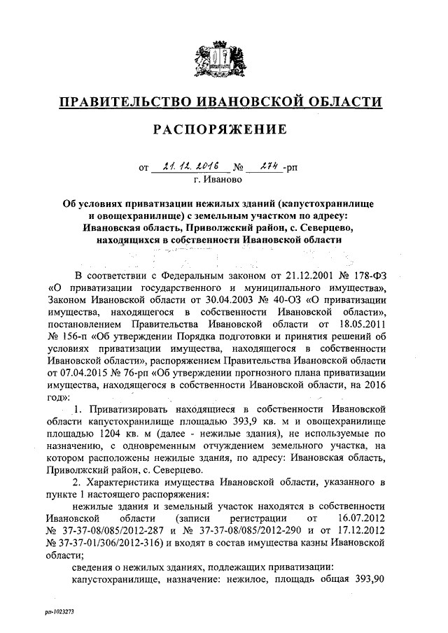 Распоряжение Правительства Ивановской области от 21.12.2016 N 274-рп "Об условиях приватизации нежилых зданий (капустохранилище и овощехранилище) с земельным участком по адресу: Ивановская область, Приволжский район, с. Северцево, находящихся в собственности Ивановской области"