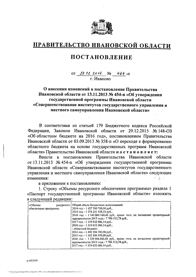 Постановление Правительства Ивановской области от 29.12.2016 N 464-п "О внесении изменений в постановление Правительства Ивановской области от 13.11.2013 N 454-п "Об утверждении государственной программы Ивановской области "Совершенствование институтов государственного управления и местного самоуправления Ивановской области"