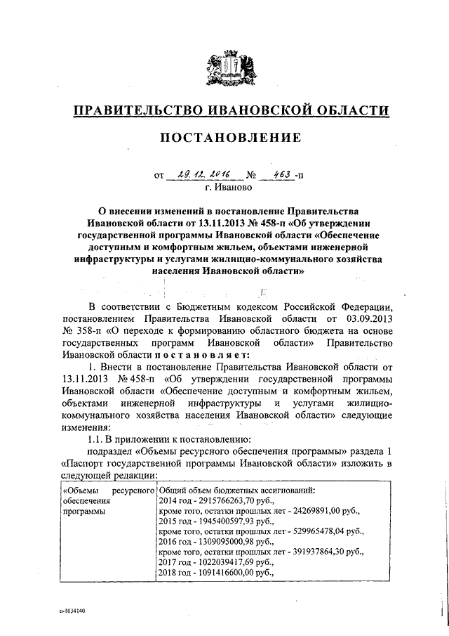 Постановление Правительства Ивановской области от 29.12.2016 N 463-п "О внесении изменений в постановление Правительства Ивановской области от 13.11.2013 N 458-п "Об утверждении государственной программы Ивановской области "Обеспечение доступным и комфортным жильем, объектами инженерной инфраструктуры и услугами жилищно-коммунального хозяйства населения Ивановской области" (вместе с "Подпрограммой "Обеспечение жильем отдельных категорий граждан", "Порядком предоставления и расходования субсидий из бюджета Ивановской области бюджетам муниципальных образований Ивановской области в целях реализации мероприятий по переселению граждан из аварийного жилищного фонда")