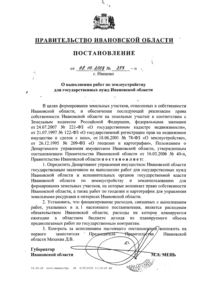 Постановление Правительства Ивановской области от 08.10.2008 N 257-п "О выполнении работ по землеустройству для государственных нужд Ивановской области"