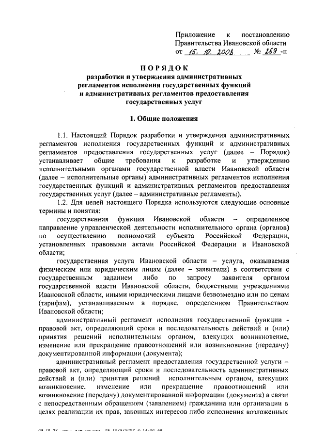 Постановление Правительства Ивановской области от 15.10.2008 N 269-п "Об административных регламентах исполнения государственных функций и административных регламентах предоставления государственных услуг" (вместе с "Порядком разработки и утверждения административных регламентов исполнения государственных функций и административных регламентов предоставления государственных услуг")
