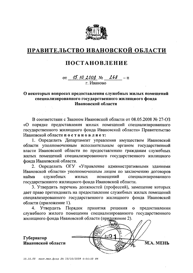 Постановление Правительства Ивановской области от 15.10.2008 N 268-п "О некоторых вопросах предоставления служебных жилых помещений специализированного государственного жилищного фонда Ивановской области" (вместе с "Перечнем должностей (профессий), замещение которых дает право претендовать на предоставление служебных жилых помещений специализированного государственного жилищного фонда Ивановской области", "Порядком принятия решения о предоставлении служебного жилого помещения специализированного государственного жилищного фонда Ивановской области")