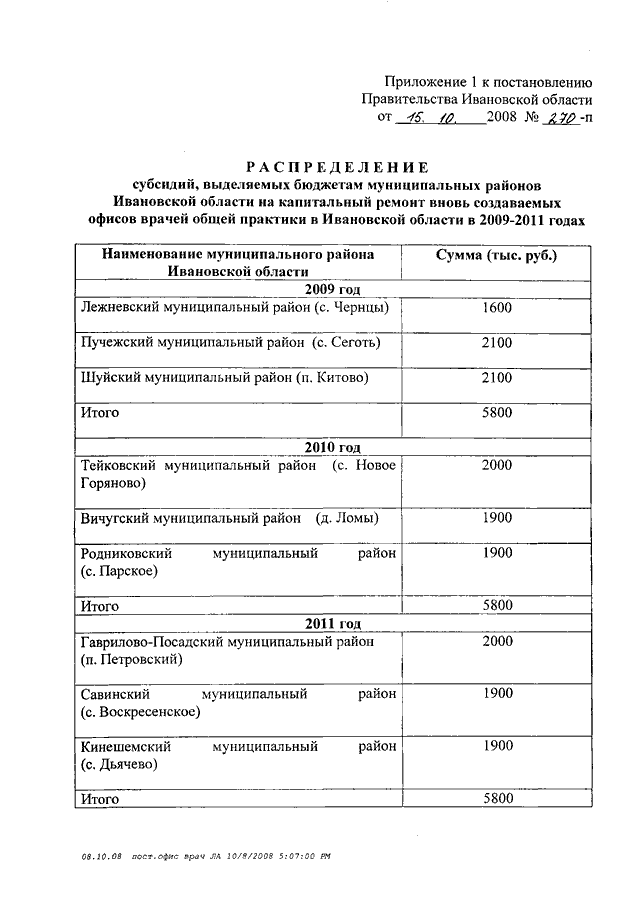 Постановление Правительства Ивановской области от 15.10.2008 N 270-п "О распределении и порядке расходования субсидий, выделяемых бюджетам муниципальных районов Ивановской области на капитальный ремонт вновь создаваемых офисов врачей общей практики в Ивановской области в 2009 - 2011 годах"