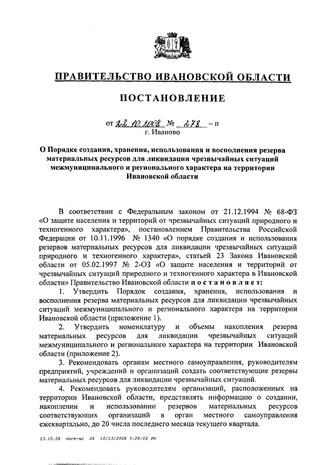 Постановление Правительства Ивановской области от 22.10.2008 N 278-п "О порядке создания, хранения, использования и восполнения резерва материальных ресурсов для ликвидации чрезвычайных ситуаций межмуниципального и регионального характера на территории Ивановской области" (вместе с "Номенклатурой и объемами накопления резерва материальных ресурсов для ликвидации чрезвычайных ситуаций межмуниципального и регионального характера на территории Ивановской области")