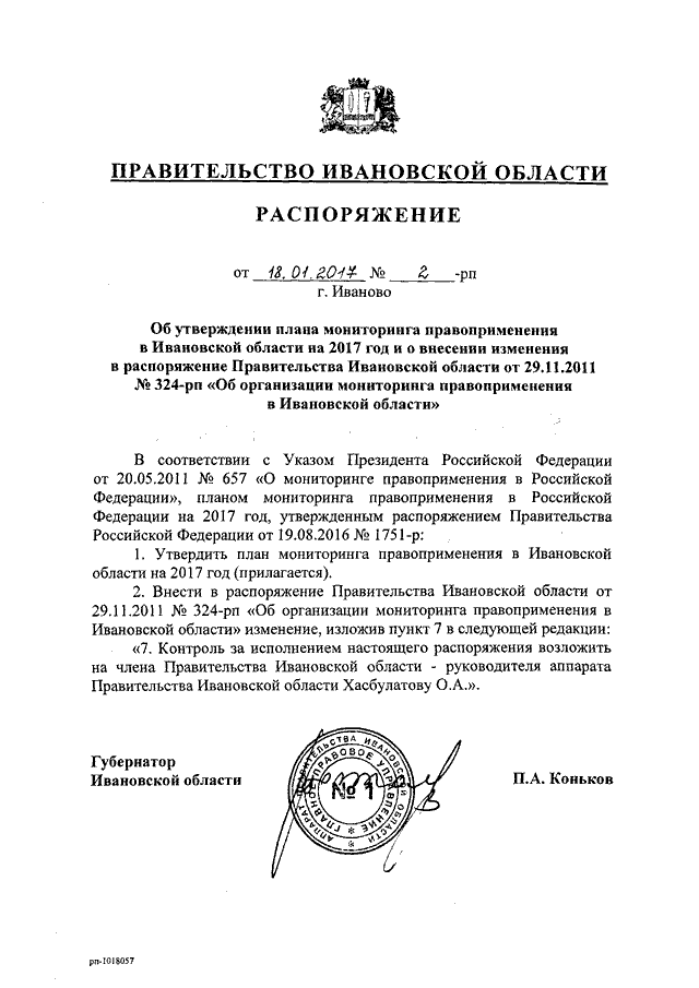 Распоряжение Правительства Ивановской области от 18.01.2017 N 2-рп "Об утверждении плана мониторинга правоприменения в Ивановской области на 2017 год и о внесении изменения в распоряжение Правительства Ивановской области от 29.11.2011 N 324-рп "Об организации мониторинга правоприменения в Ивановской области"