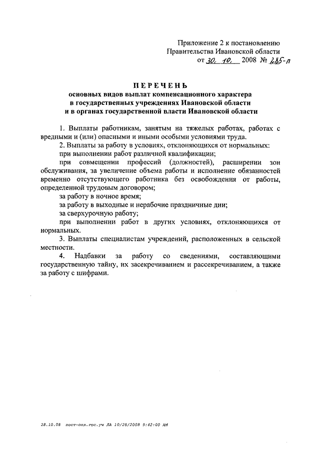 Постановление Правительства Ивановской области от 30.10.2008 N 285-п "О системах оплаты труда работников государственных учреждений Ивановской области и органов государственной власти Ивановской области" (вместе с "Положением об установлении систем оплаты труда работников государственных учреждений Ивановской области и органов государственной власти Ивановской области", "Перечнем основных видов выплат компенсационного характера в государственных учреждениях Ивановской области и в органах государственной власти Ивановской области", "Перечнем основных видов выплат стимулирующего характера в государственных учреждениях Ивановской области и в органах государственной власти Ивановской области")