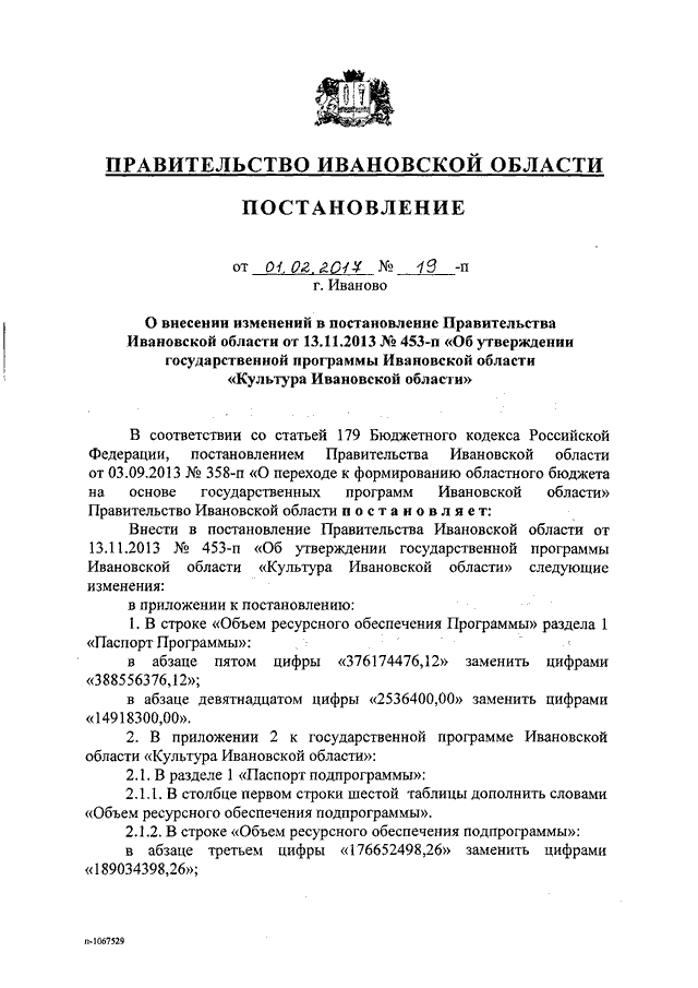 Постановление Правительства Ивановской области от 01.02.2017 N 19-п "О внесении изменений в постановление Правительства Ивановской области от 13.11.2013 N 453-п "Об утверждении государственной программы Ивановской области "Культура Ивановской области" (вместе с "Порядком предоставления и распределения субсидий из областного бюджета бюджетам муниципальных образований Ивановской области на обеспечение развития и укрепления материально-технической базы муниципальных домов культуры Ивановской области")