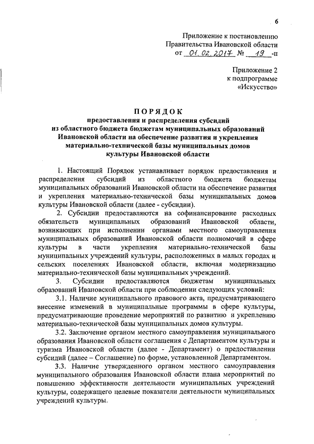 Постановление Правительства Ивановской области от 01.02.2017 N 19-п "О внесении изменений в постановление Правительства Ивановской области от 13.11.2013 N 453-п "Об утверждении государственной программы Ивановской области "Культура Ивановской области" (вместе с "Порядком предоставления и распределения субсидий из областного бюджета бюджетам муниципальных образований Ивановской области на обеспечение развития и укрепления материально-технической базы муниципальных домов культуры Ивановской области")