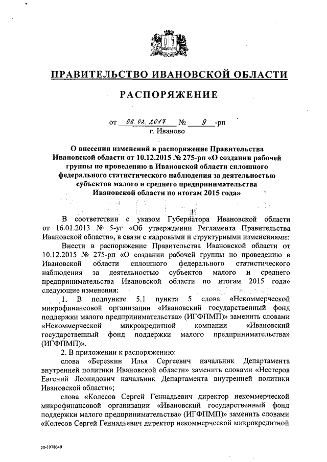 Распоряжение Правительства Ивановской области от 06.02.2017 N 9-рп "О внесении изменений в распоряжение Правительства Ивановской области от 10.12.2015 N 275-рп "О создании рабочей группы по проведению в Ивановской области сплошного федерального статистического наблюдения за деятельностью субъектов малого и среднего предпринимательства Ивановской области по итогам 2015 года"
