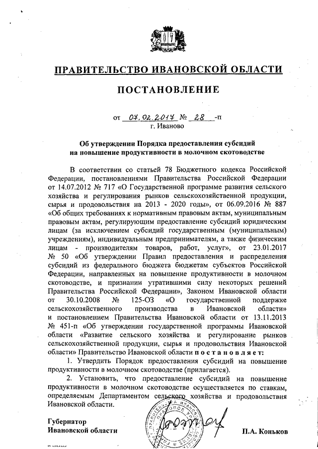 Постановление Правительства Ивановской области от 07.02.2017 N 28-п "Об утверждении Порядка предоставления субсидий на повышение продуктивности в молочном скотоводстве"