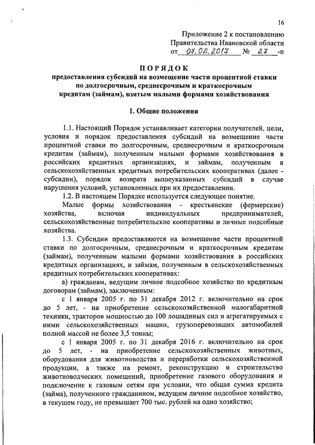 Постановление Правительства Ивановской области от 07.02.2017 N 27-п "Об утверждении порядков предоставления субсидий на возмещение части процентной ставки по краткосрочным кредитам (займам), субсидий на возмещение части процентной ставки по долгосрочным, среднесрочным и краткосрочным кредитам (займам), взятым малыми формами хозяйствования"