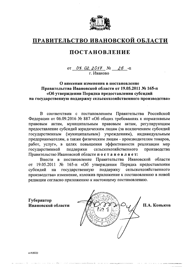 Постановление Правительства Ивановской области от 07.02.2017 N 26-п "О внесении изменения в постановление Правительства Ивановской области от 19.05.2011 N 165-п "Об утверждении Порядка предоставления субсидий на государственную поддержку сельскохозяйственного производства"