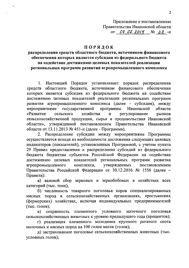 Постановление Правительства Ивановской области от 07.02.2017 N 22-п "Об утверждении Порядка распределения средств областного бюджета, источником финансового обеспечения которых является субсидия из федерального бюджета на содействие достижению целевых показателей реализации региональных программ развития агропромышленного комплекса"