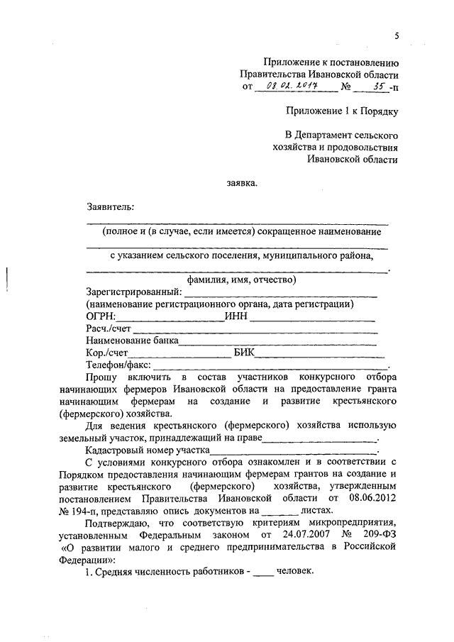 Постановление Правительства Ивановской области от 08.02.2017 N 35-п "О внесении изменений в постановление Правительства Ивановской области от 08.06.2012 N 194-п "Об утверждении Порядка предоставления начинающим фермерам грантов на создание и развитие крестьянского (фермерского) хозяйства и единовременной помощи на бытовое обустройство, одним из источников финансового обеспечения которых является субсидия из федерального бюджета"